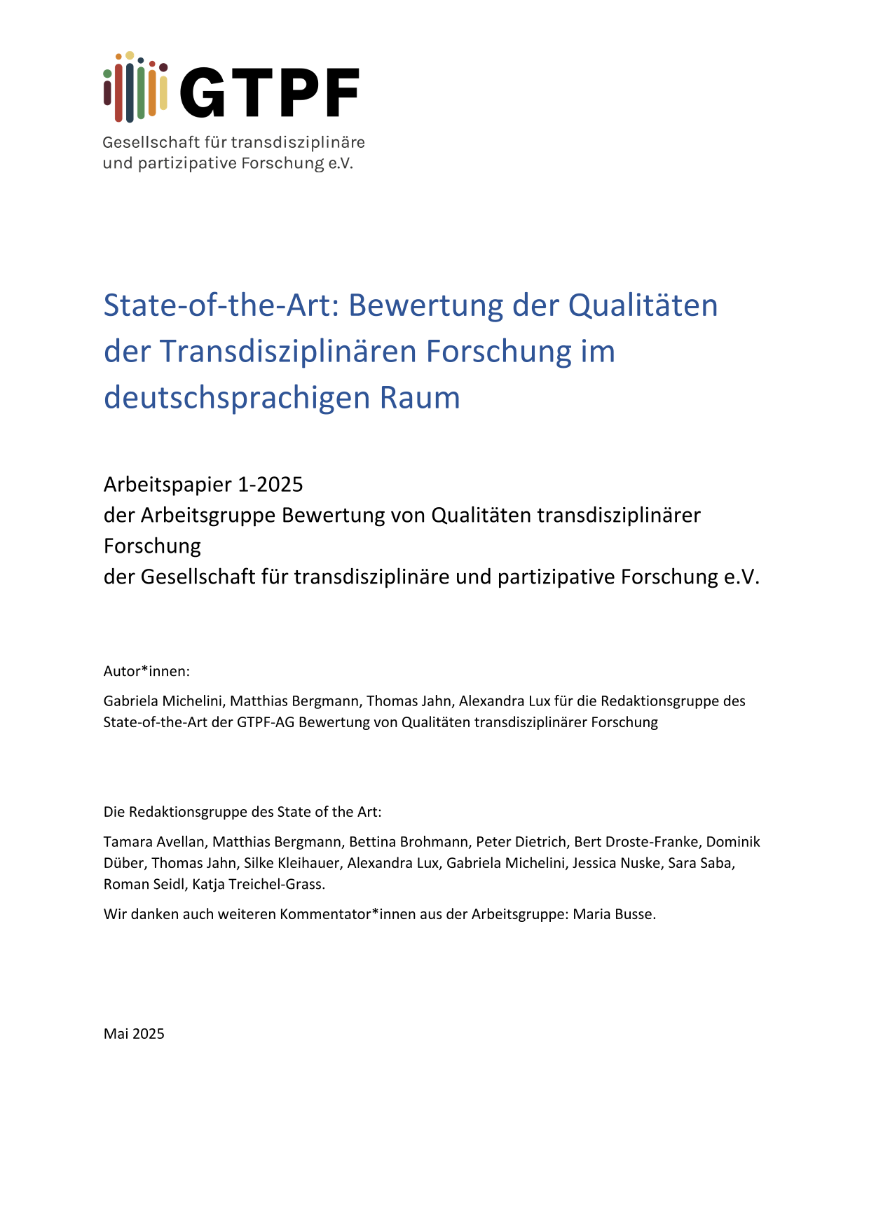 The Working Paper 1-2025 by the Working Group on the Assessment of the Qualities of Transdisciplinary Research, Society for Transdisciplinary and Participatory Research (GTPF AG) provides an overview of the current state of knowledge (State-of-the-Art) regarding quality criteria in transdisciplinary research with a focus on the German-speaking discourse.