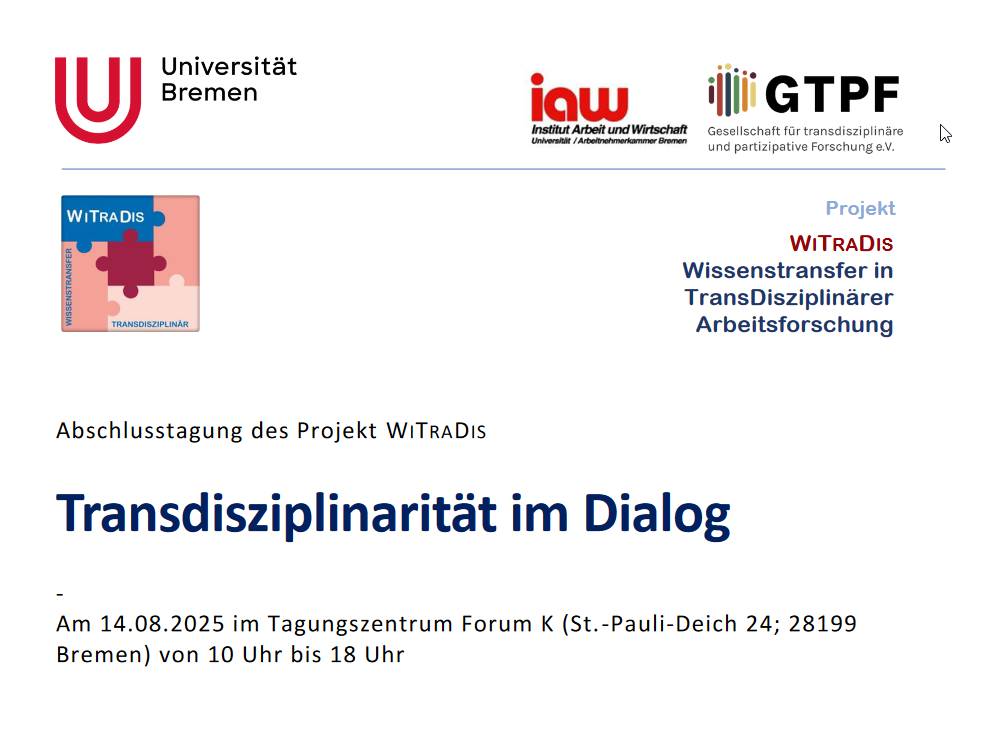 Das Projekt WiTraDis ist am GTPF-Fördermitglied Institut Arbeit und Wirtschaft (iaw) an der Universität Bremen verankert. Ziel des Projektes war es, Gelingensbedingungen für Wissenstransfer am Beispiel der vom BMBF-geförderten transdisziplinären Arbeitsforschung der letzten 30 Jahre (1990-2020) herauszuarbeiten. Im Rahmen der Abschlussveranstaltung sollen die Erkenntnisse der Projektarbeit vorgestellt und im Dialog mit Expert:innen aus unterschiedlichen Disziplinen und Gästen diskutiert werden. Vorgestellt werden die Ergebnisse einer umfangreichen Dokumentenanalyse der BMBF- Förderprogramme sowie ausgewählter Förderschwerpunkte und die Auswertung einer Reihe von Expert:inneninterviews mit unterschiedlichen Akteuren der BMBF-geförderten Arbeitsforschung (Forschende verschiedener Forschungseinrichtungen, Projektträger sowie intermediäre Akteure). Darüber hinaus entwickelte das Projekt ein Kriterien- und Bewertungsmodell für den transdisziplinären Wissenstransfer im gesamten Forschungs- und Entwicklungsprozess sowie ein Gestaltungsmodell zur Darstellung von transdisziplinärem Wissenstransfer.